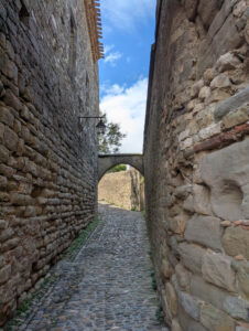 Wir haben diesmal etwas Schwierigkeiten, einen passenden Parkplatz nicht weit von der Festung zu bekommen und unser Navi führt uns zuerst einmal in die falsche Richtung – durch die engen Gassen der Unterstadt. Dann finden wir aber den Parkplatz, den wir damals vor Jahren schon angesteuert hatten und machen uns zu Fuß an den Aufstieg zur Festung. Wir werden von der Rückseite hineinkommen und erklimmen recht „authentisch“ und abenteuerlich den äußeren Festungsring. Dafür so ziemlich alleine und mit herrlichem Ausblick …